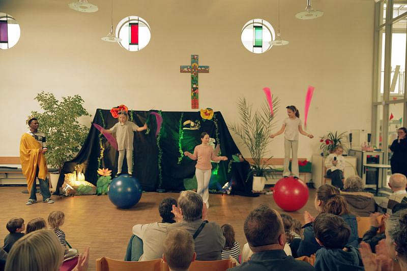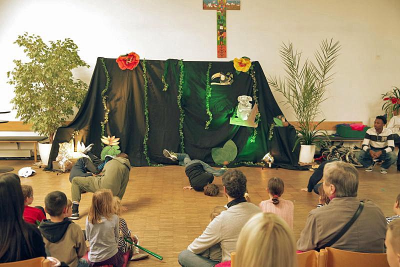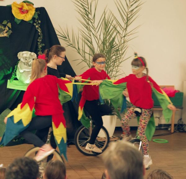Dreimal im Jahr gibt es eine Aufführung, die mit den Kindern erarbeitet wird. Aus ihren Wünschen werden Choreografie, Bühnenbild und Kostüme entwickelt. Das Publikum ist jedesmal verzaubert, wenn z.B. der weise König Jojo in seinem Dschungelschloss einen Wettbewerb für alle Tierarten veranstaltet. Die Baumkronen-Tribünen sind voll besetzt. Spannung liegt in der Dschungelluft, als die Lemuren am Schwebebalken auftreten, gefolgt von den seilspringenden Fröschen. Allerdings konkurrieren sie mit den Koalas auf der Laufkugel und den Papageien auf dem Einrad. Hervorragend auch: der Breakdance der Brüllaffen. Am Schluss werden alle als Gewinner ausgezeichnet! Denn, so der weise König Jojo: wichtig ist nicht, wer gewinnt, wichtig ist, gemeinsam etwas so Wunderbares zu schaffen.