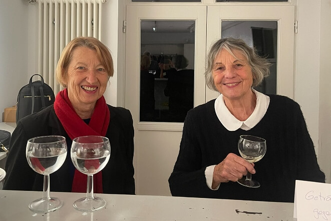 Die Präsentation überzeugte durch eine durchdachte Hängung, die den einzelnen Arbeiten Raum zum Atmen ließ. Im anschließenden Austausch wurde lebhaft über die Werke diskutiert, bevor der Abend in eine von Renate Bürner geleitete, heitere Kunstversteigerung überging. Drei der vier angebotenen Bilder fanden rasch neue Besitzer*innen; begleitet von viel Applaus, herzlichem Lachen und angeregten Gesprächen bei einem Glas Wein.