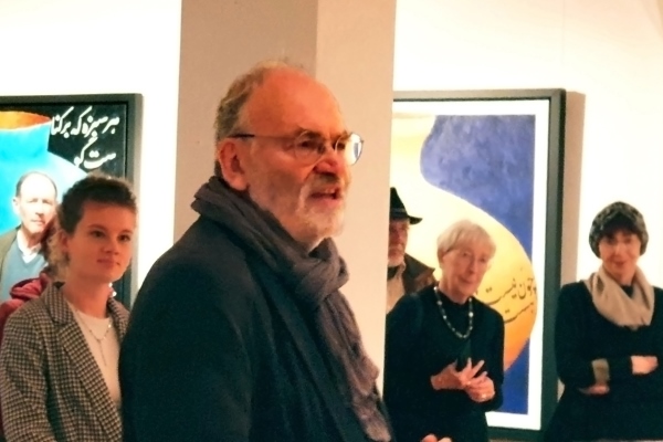 Etwa 40 Minuten später führte Peter Gregorian, nun mit dem Saxophon, die Gäste musikalisch hinüber in das Hauptgebäude, wo die Ausstellung des Kolibri-Kunst-Kabinetts eröffnet wurde. Dort präsentierte Kuratorin Charlotte Kosean eine sorgfältig zusammengestellte Auswahl von Werken, die sich in mehreren Räumen unterschiedlichen Themen widmen; von Flucht und Migration über Landschaft und Natur bis hin zu existenziellen Fragen unserer Zeit. Ihre Einführung per Beamer wurde mit großer Aufmerksamkeit verfolgt.