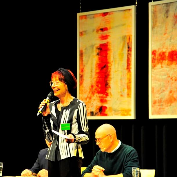 Unter den knapp 250 Besucherinnen waren auch 58 Schüler*innen von Berufsoberschulen und einem Gymnasium, deren Teilnahme durch die Stiftung Hubert Beck ermöglicht wurde. Im Vorfeld auf die Lesung vorbereitet, nutzten sie im Anschluss die Gelegenheit, den Schauspieler*innen Fragen zu stellen. Viele von ihnen erlebten ihre erste Lesung und zeigten sich beeindruckt von der intensiven Wirkung, die allein durch Sprache, Stimme, Bild und Klang entstehen kann.